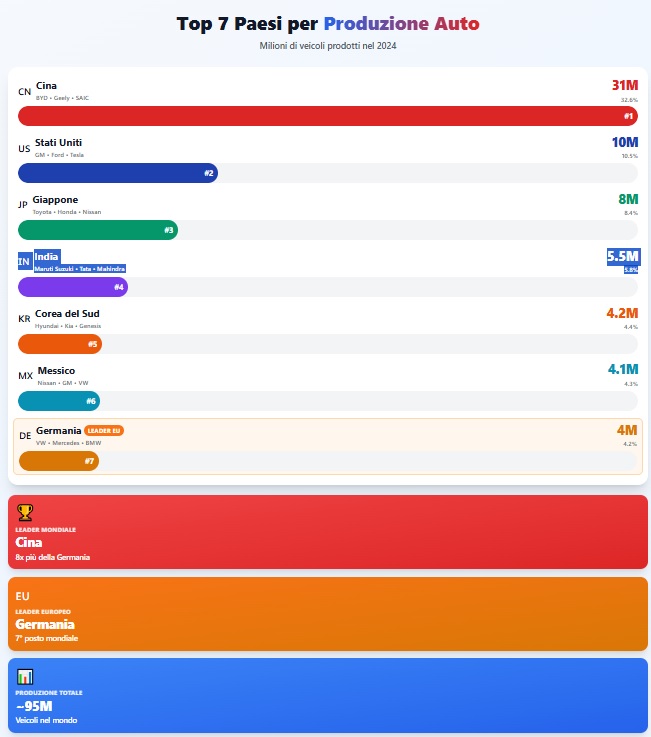 La Cina domina incontrastata con oltre 31 milioni di unità prodotte, una cifra che supera di quasi otto volte la produzione tedesca. Seguono gli Stati Uniti con 10 milioni di veicoli e il Giappone con 8 milioni. Questo divario non è semplicemente numerico: rappresenta un profondo riassetto delle dinamiche industriali mondiali.