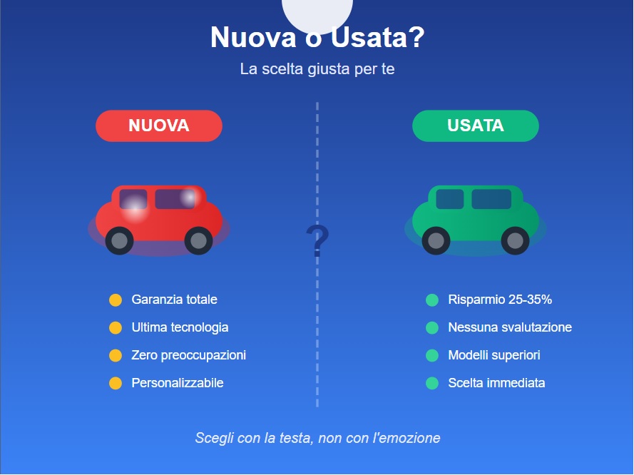 Ogni anno migliaia di italiani si trovano di fronte allo stesso dilemma: meglio puntare sulla sicurezza di un’auto nuova o sull’opportunità di risparmio dell’usato? La verità è che non esiste una risposta universale, ma solo quella giusta per te. Ecco come trovarla.